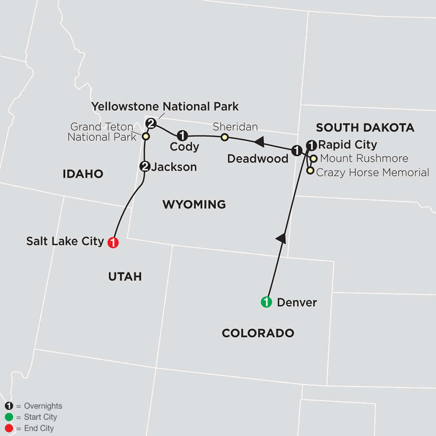BLACK HILLS OF SOUTH DAKOTAScenic driveMOUNT RUSHMOREVisit Crazy Horse Memorial and Mount Rushmore National MemorialYELLOWSTONE NATIONAL PARKStay overnight inside the park or in West Yellowstone; sightseeingJACKSONGrand Teton National Park sightseeing; glacier-fed Jenny LakeSALT LAKE CITYSightseeing