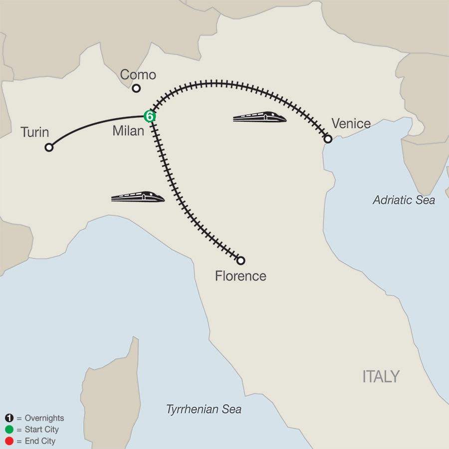 On this Splendors of Italy tour, you'll spend six nights in Milan with leisure time to explore the city and excursions to Venice, Turin, and Florence. In each of these cities, you'll have a guided tour of the must-see attractions. In Milan, your sightseeing includes a visit to the magnificent Sforzesco Castle grounds and museum; the glass-domed Galleria, with its designer shops and famous cafés; and more. Among the many sights in Venice, visit St. Mark's Basilica; Doges’ Palace, with its gothic architecture; and the Bridge of Sighs, built in the 17th century. Leisure time in the city gives you the opportunity to take an optional gondola ride or perhaps to sit in St. Mark's Square for prime people watching.